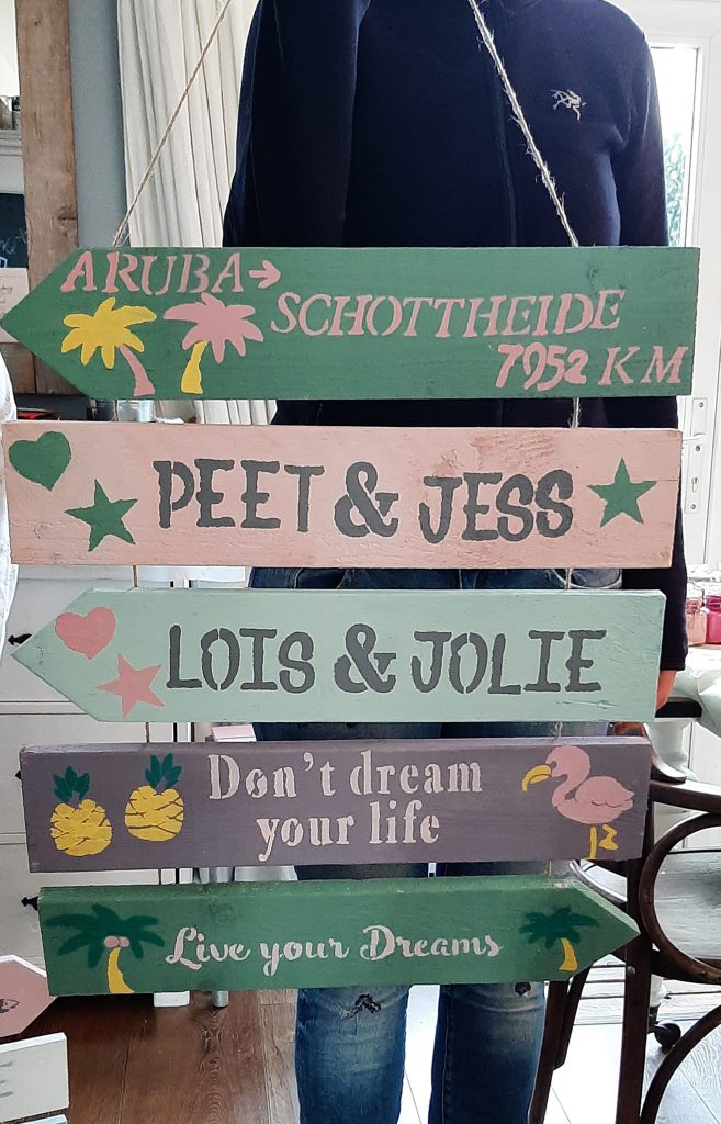 Je gaat 5 bordjes / pijlen schilderen in gewenste kleur. Daarna sjabloneer je er een leuke tekst of quote op. Dan komt hij aan een touw te hangen en kan je hem buiten of binnen neerhangen.